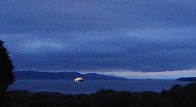 Da die Führung durch uns über die Blumeninsel und den Nationalpark von Glengarriff schon vor Langem gebucht wurden, wissen wir: Da kommt Arbeit und glitzert und brummt die Nacht über "im Vorgarten". | As the tours through the garden island and the nature reserve in Glengarriff with us were booked long time ago we knew: There is a job coming. It was sparkling and humming all night right in front of our garden.